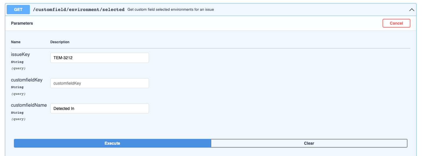This endpoint return the list of environments selected by an environment custom field of a given issue: