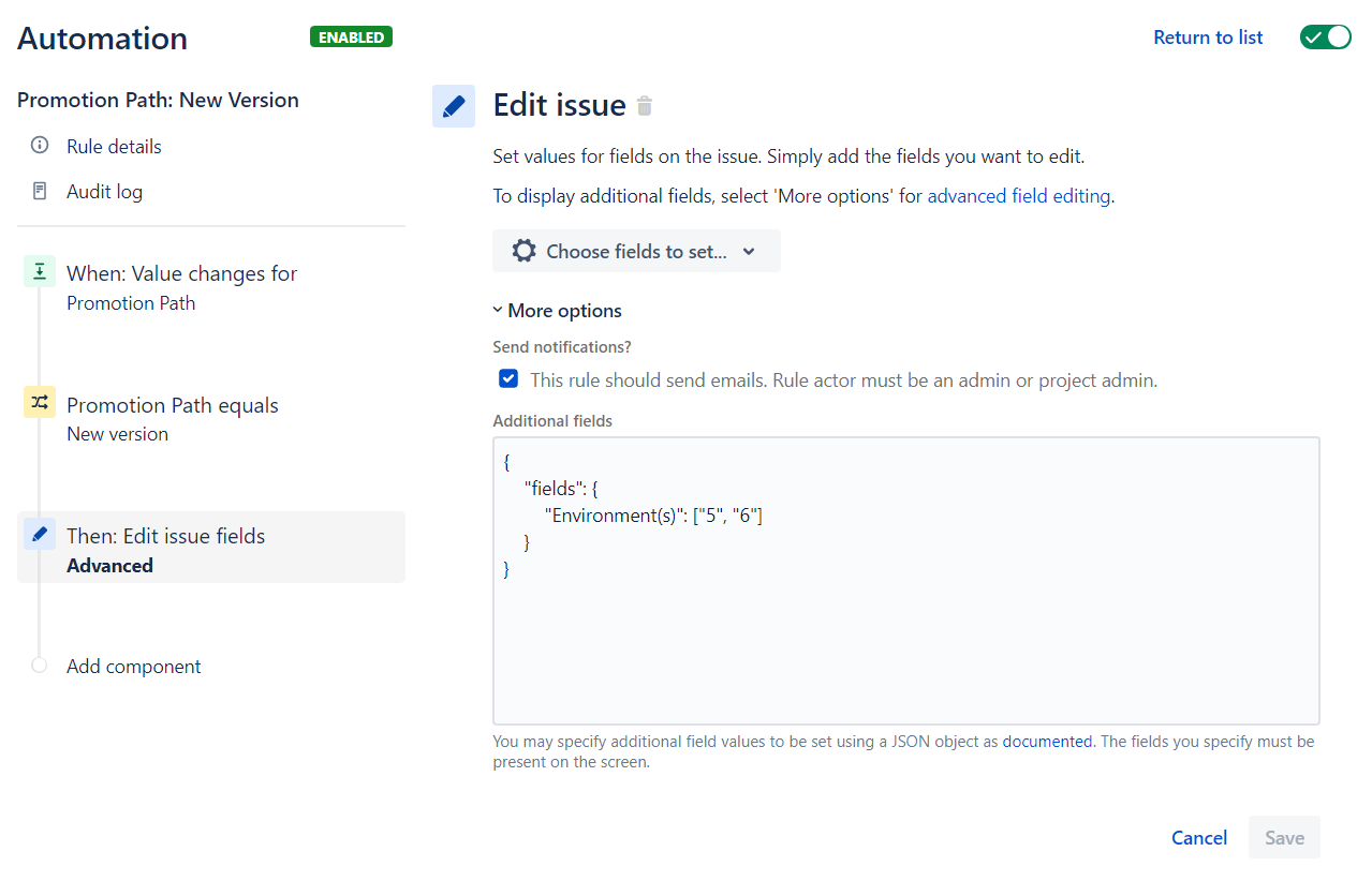 This guide covers a specific use case where Jira Automation is configured to automatically select the target Environment of our Change Requests (Jira issues) based on the type of change specified in the Promotion Path field, such as version, patch, or production fix.