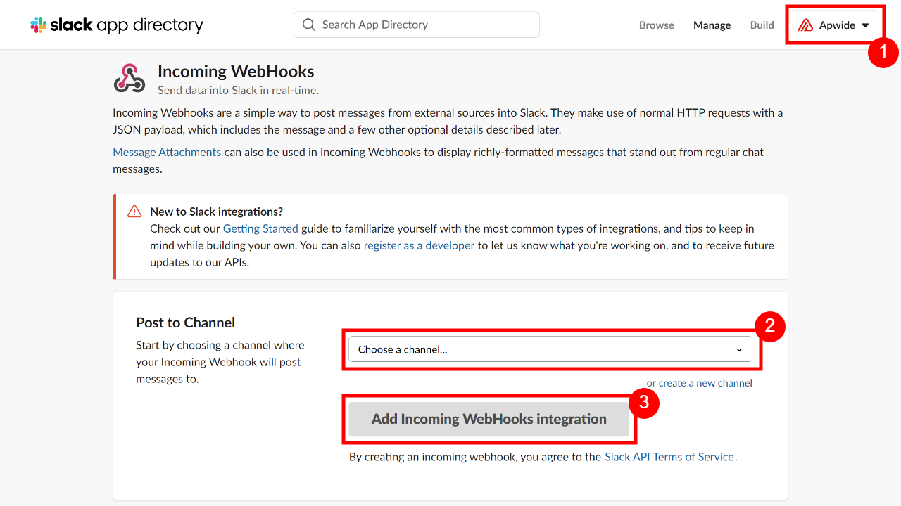 Click on the “Add Incoming WebHooks integration”