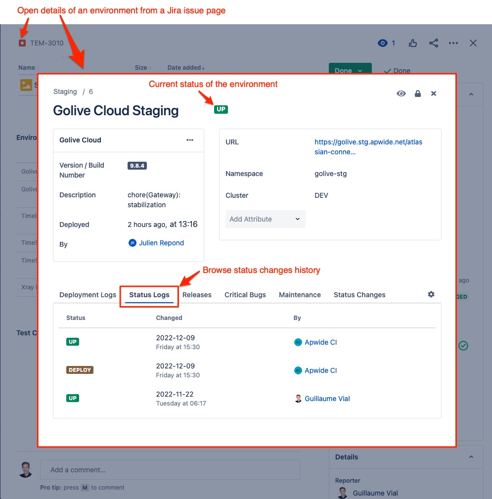 You can easily browse the status change logs of your environments from the different types of environment views, issue page and environment details right in Jira.