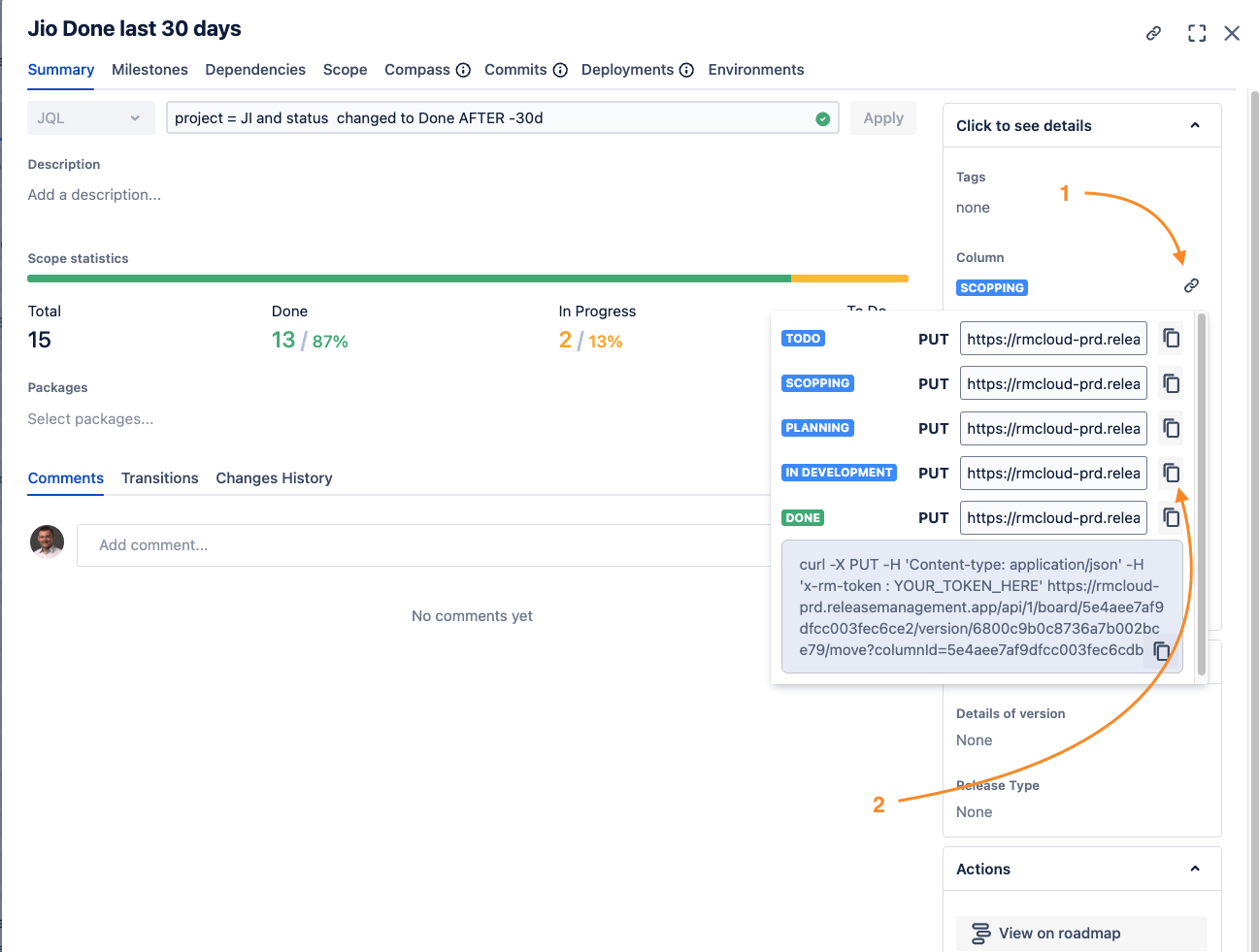 Golive triggers a Webhook that moves the related version to the next column in the RM board.