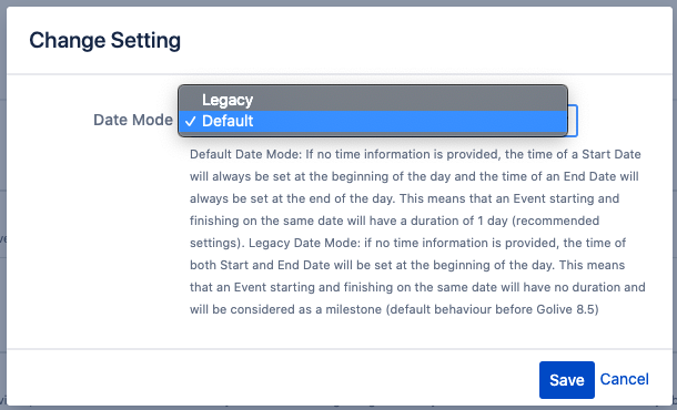 You can now change the way your dates are interpreted by the timeline. With the new date mode, an Event starting and finishing on the same date will have a duration of 1 day.