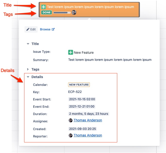 For each of your calendars, choose which Issue fields should be visible in the following 3 areas: