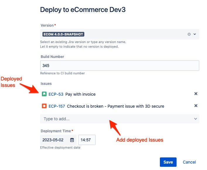 When deploying a Jira version, its “Done” issues are automatically proposed to be added to the new deployment