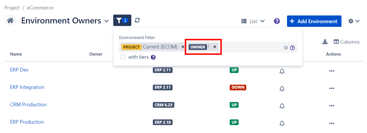 You can now leverage our new search criterion to filter for Environments that don't have a particular attribute defined. By using this search criterion, you’ll retrieve all Environments that don't possess the specified attribute. For example, to find environments without an Owner attribute, use the filter Owner=!.