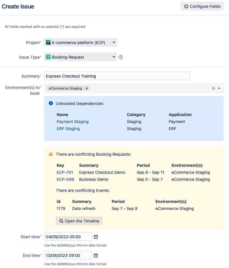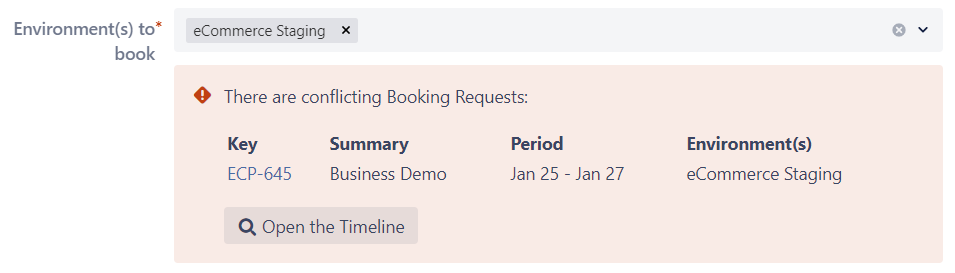 issueTypeName: Name of your Booking Request issue type.startDateFieldName: Name of your booking start date/time field.endDateFieldName: Name of your booking end date/time field.environmentFieldName: Name of your Environment custom field.helpFieldName: Field name for displaying warning messages. Defaults toendDateFieldNameif undefined.timelineUrl: URL for the “Open the Timeline” button in warning messages.dateFormat: Format for the displayed period. Defaults to Jira's date format if undefined.blocking: Set totrueto block request creation when conflicts are detected (red warning). Set tofalsefor non-blocking behavior (yellow warning):