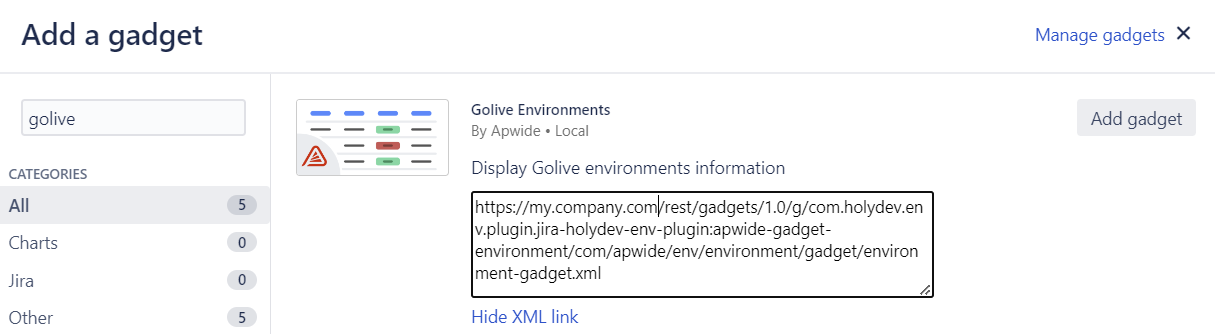 The Gadget URL can be found by clicking on “Show XML link” in the Jira “Add Gadget” screen.