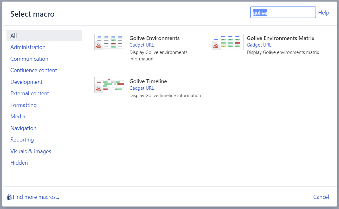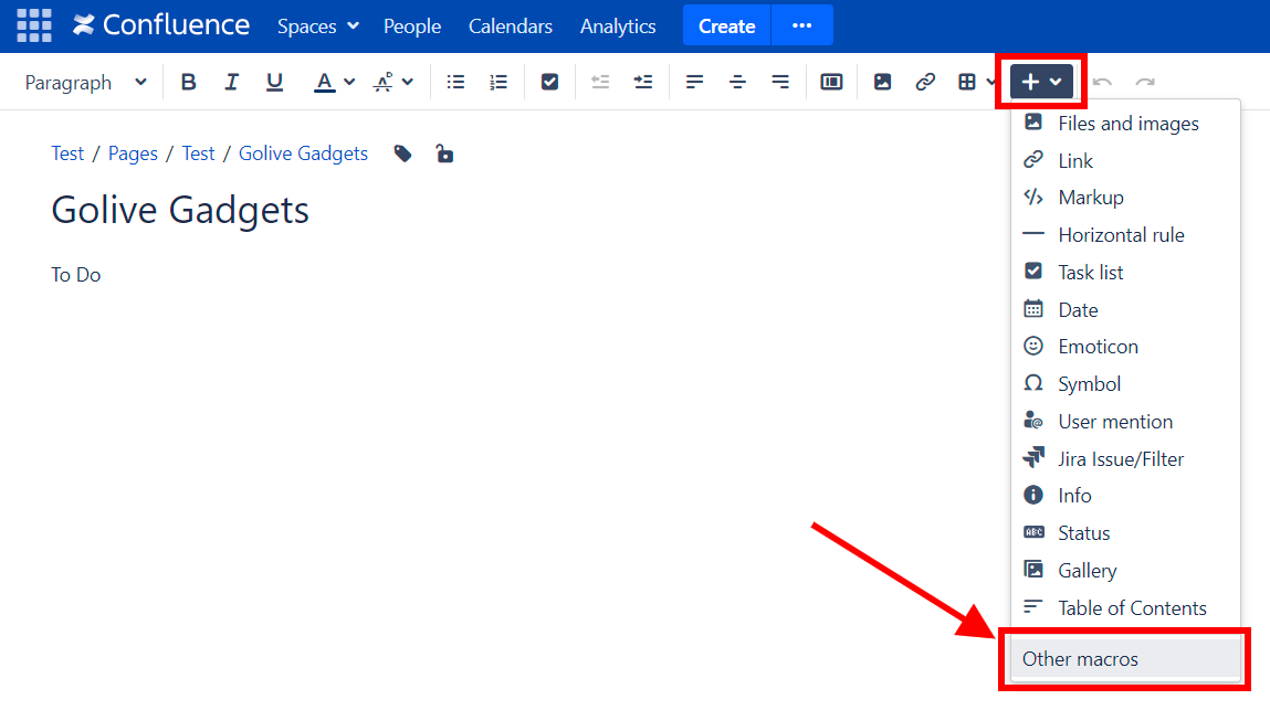 To add a Golive Gadget on a Confluence page, click on the “Insert more content” button and “Other macros”.