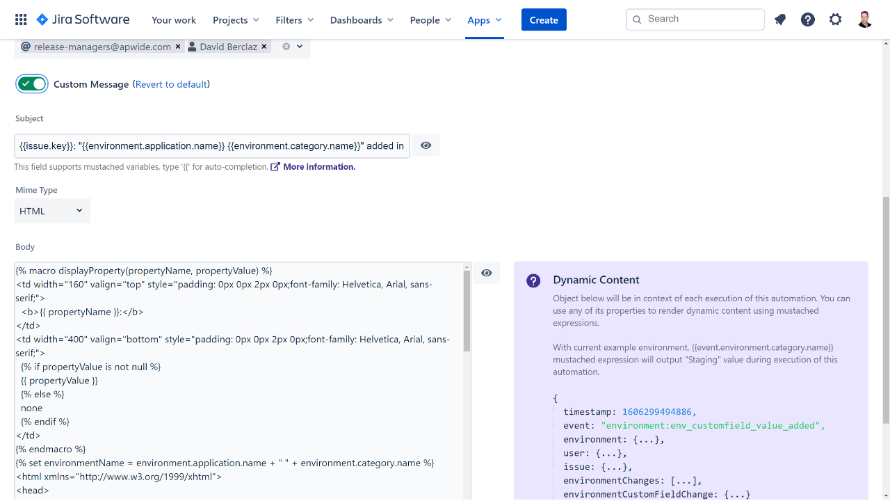 You can customize your email Subject and Body with static or dynamic content using expressions, conditions and loops (Pebble Templates).