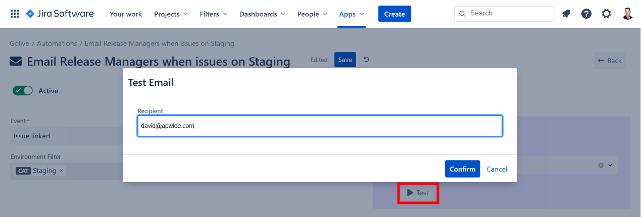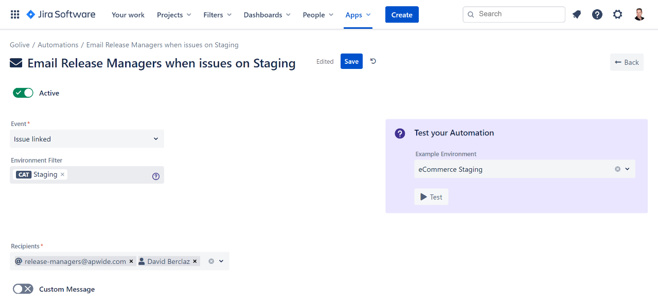In order to test your Automation, choose an Example Environment and click on the Test button: