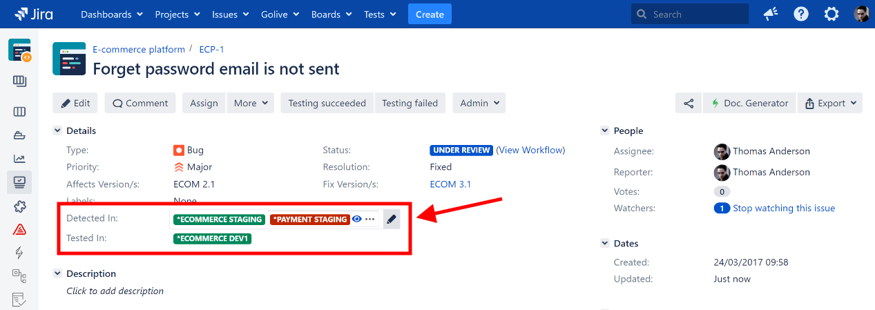 BEnvironment Custom Fields allow teams to associate Jira issues with specific Golive Environments. This helps you track accurate statistics, such as the number of issues created, reproduced, or tested in specific environments.