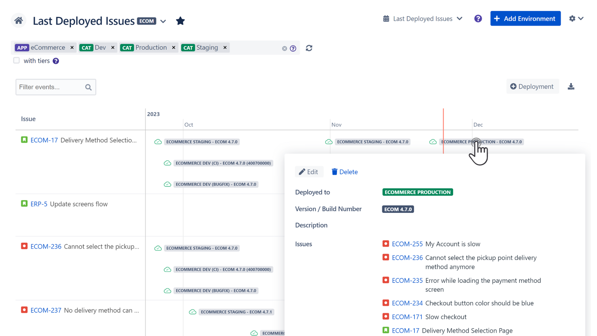 Your new "Last Deployed Issues" view displays the deployments of your Jira issues on a selection of Environments. No more communication inefficiencies as everyone will be on the same page.